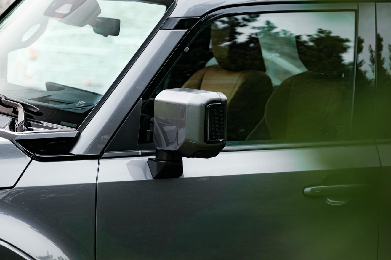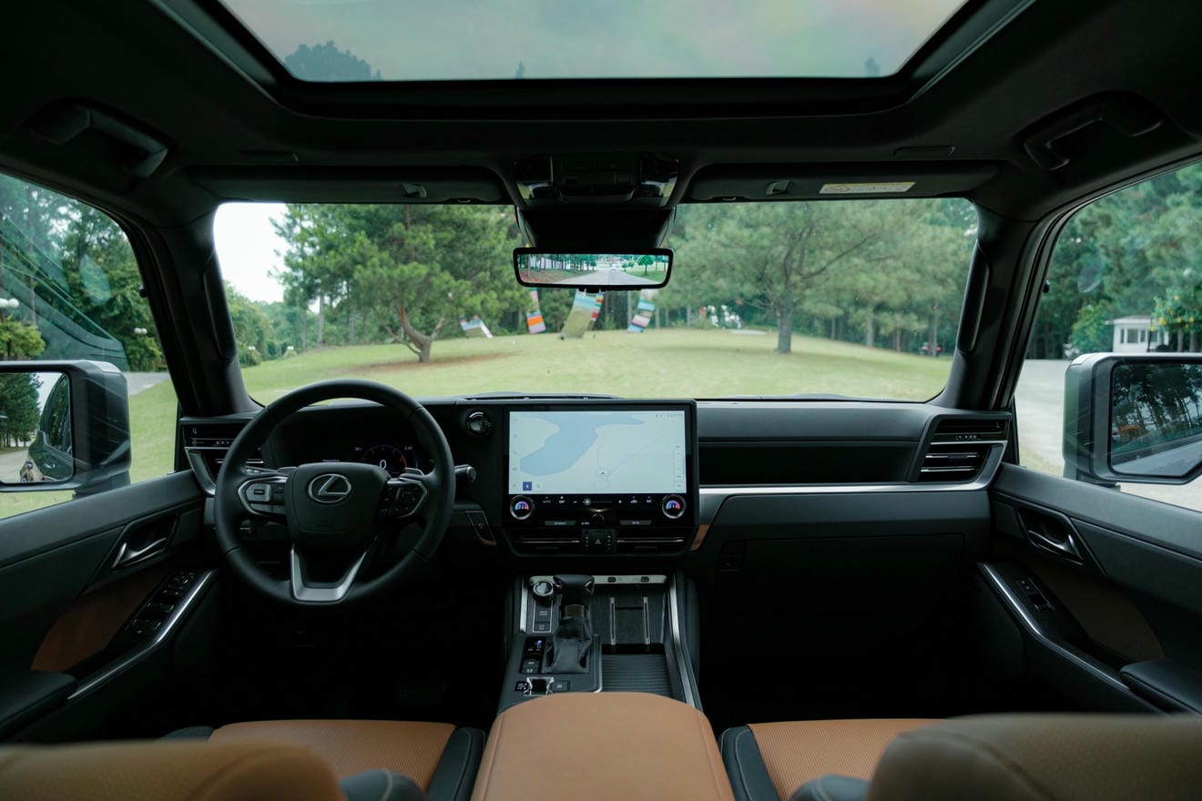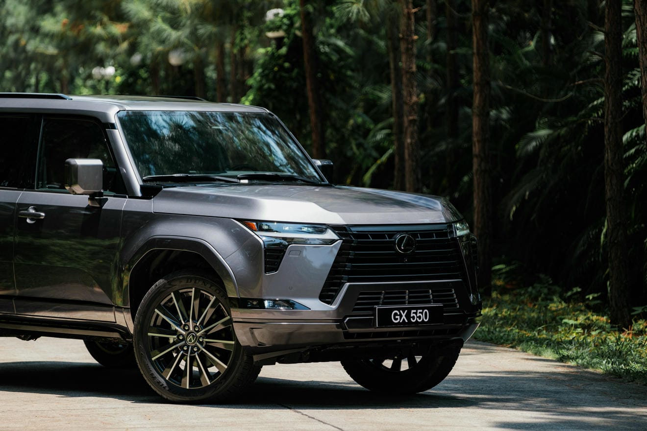 Chất SUV mạnh mẽ trên GX 550 còn được thể hiện qua thiết kế cản trước khỏe khoắn, hốc gió trung tâm hình thang phủ sơn cùng màu thân xe. Nắp ca-pô dập gân thể thao cùng kính lái thẳng đứng. Hốc bánh to kết hợp bộ la-zăng kích thước lên tới 22 inch.