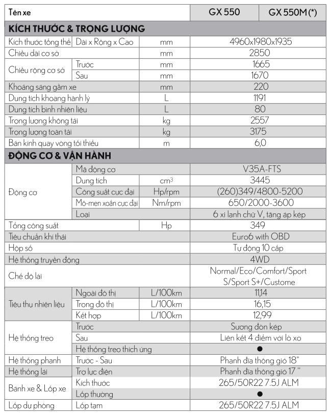Lexus GX thế hệ mới sử dụng khung gầm sát-xi rời TNGA-F vốn đang áp dụng cho Lexus LX 600 và Toyota Land Cruiser 300 Series. Theo tiết lộ từ tư vấn viên, xe bán tại Việt Nam là phiên bản GX 550 Luxury, có trọng lượng lên tới 3,175 tấn, tức nặng hơn “người tiền nhiệm” 185 kg.